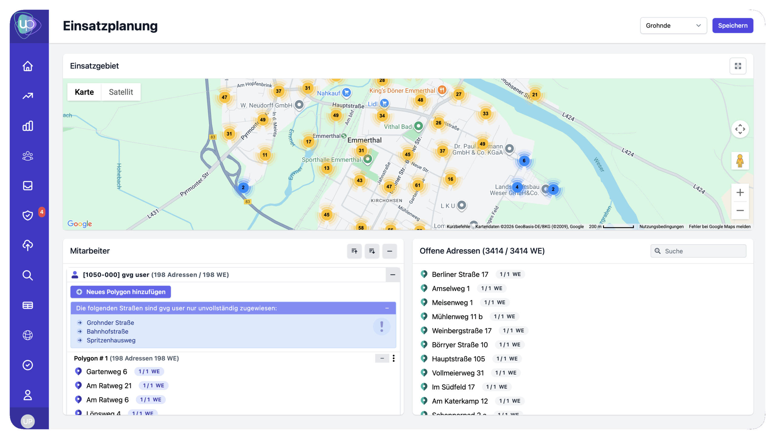 • Zentrale Projekt- & Einsatzplanung – Adressen werden digital zugewiesen, Gebiete klar abgegrenzt und Änderungen in Echtzeit an alle Beteiligten übertragen – ohne Listen oder Abstimmungsaufwand.